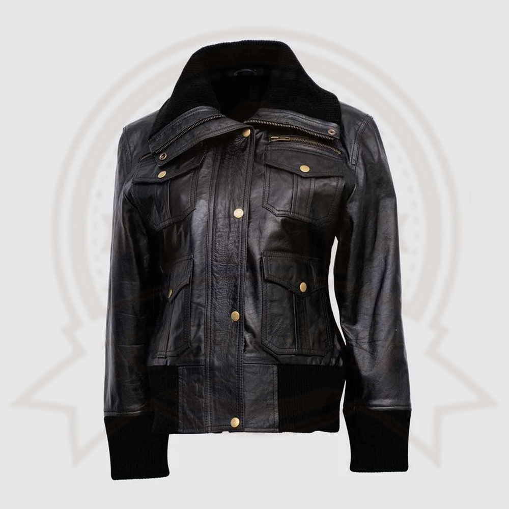 Elevate your style with the Women’s Four-Pocket Black Leather Bomber Jacket—a timeless wardrobe essential. Crafted from premium leather, this jacket offers a sleek, polished look while ensuring durability and comfort. The four-pocket design adds a functional yet stylish touch, perfect for keeping your essentials close. The bomber silhouette exudes a modern vibe, making it a versatile choice for both casual outings and dressier occasions.