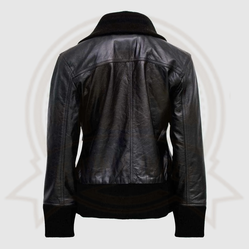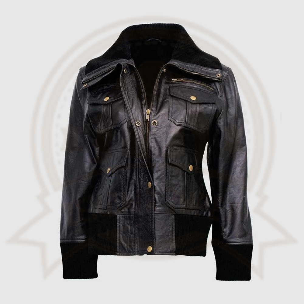 Women’s Four-Pocket Black Leather Bomber Jacket-Zenonix Impex