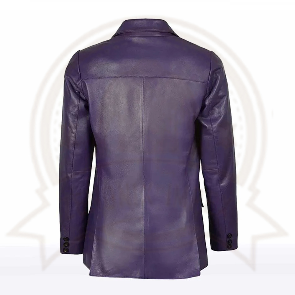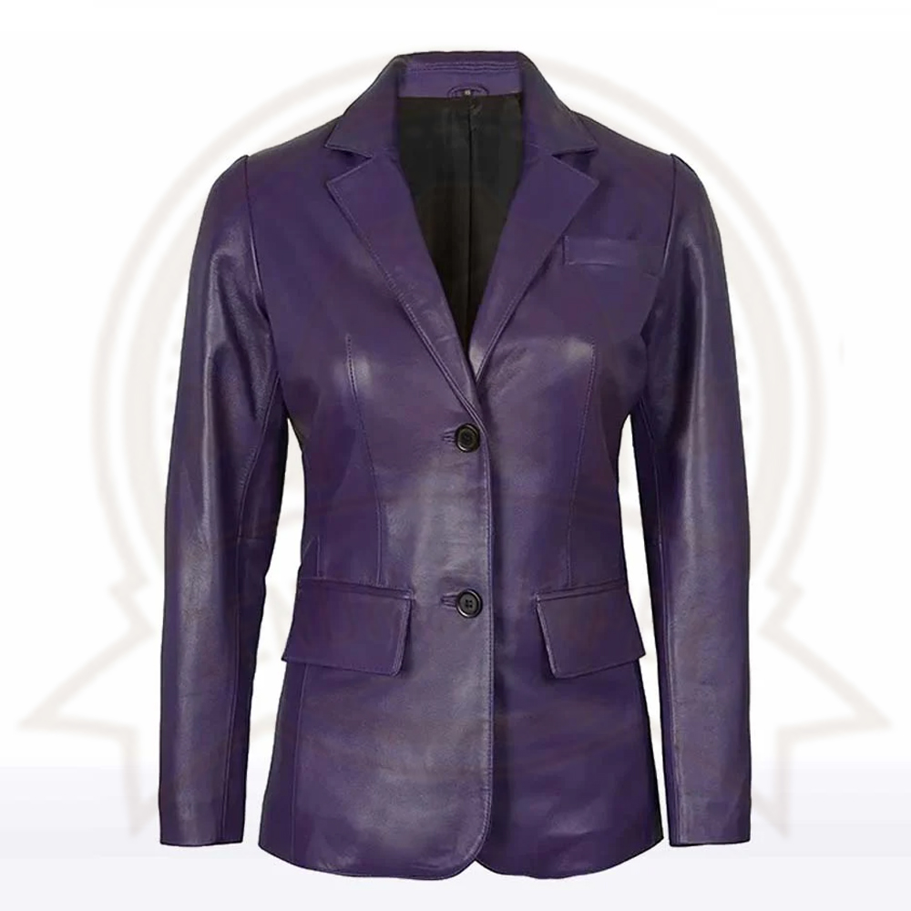 Elevate your style with this sleek women’s purple leather blazer, crafted from premium quality genuine leather for a luxurious feel and long-lasting durability. Designed with a tailored fit, it features a classic notch lapel collar, two-button front closure, and functional flap pockets for a sophisticated yet practical look. The vibrant purple hue adds a bold, modern twist to a timeless silhouette, making it perfect for both professional and casual occasions. Fully lined for comfort, this jacket ensures you stand out effortlessly wherever you go.
